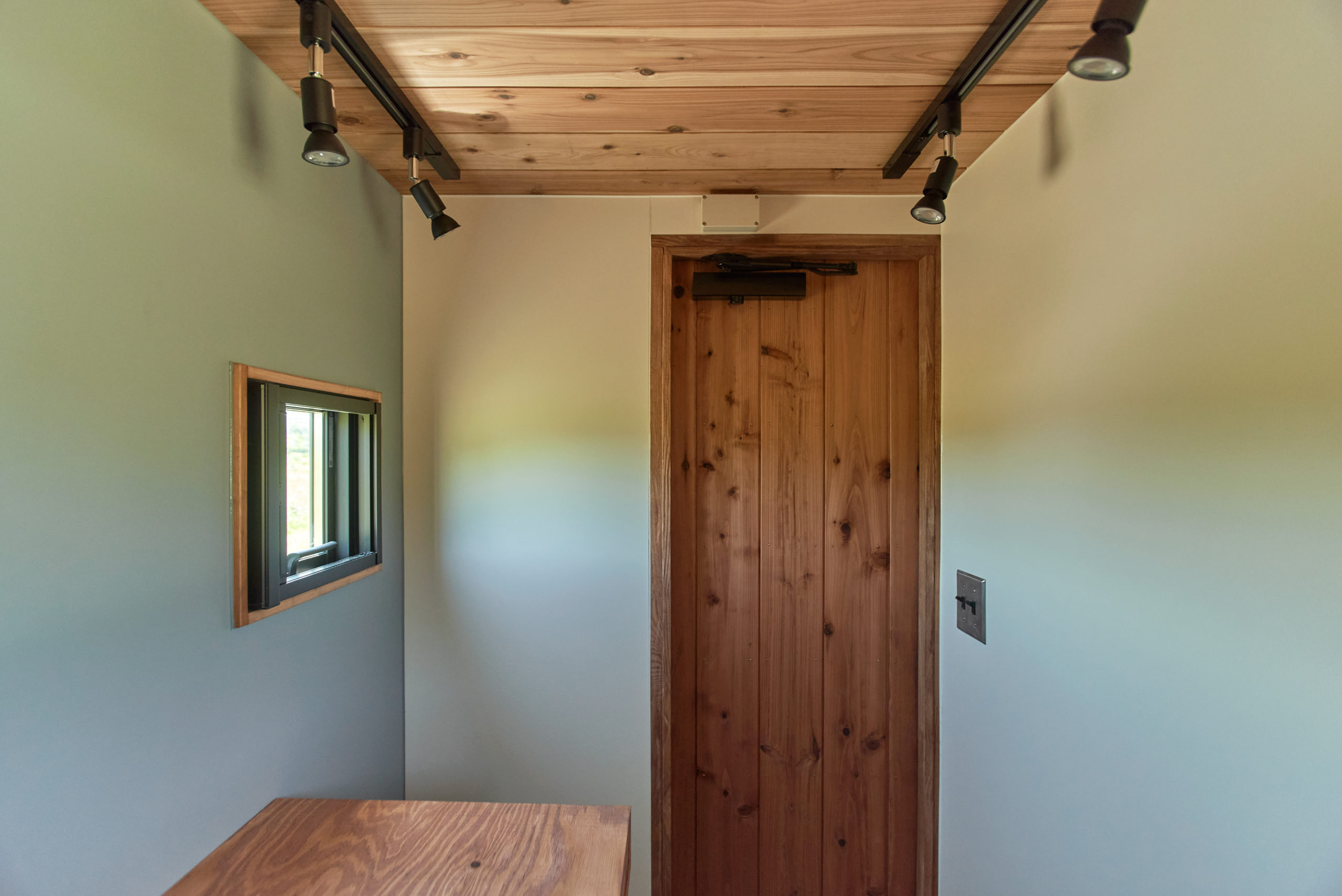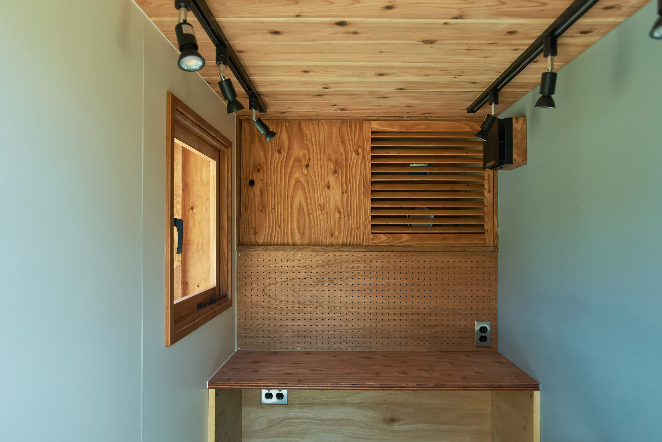<内装部>木枠組み、電気工事、断熱材(壁・天井)、内装/天井仕上げ、床仕上げ、造作物(内側作業棚、外側カウンター、基本収納)、跳ね上げ扉/販売窓口、水回り(2層シンク)、換気扇、冷蔵庫、ライティングレール、スポットライト、デザイナーセレクト照明、アルミサッシ窓、塗装、